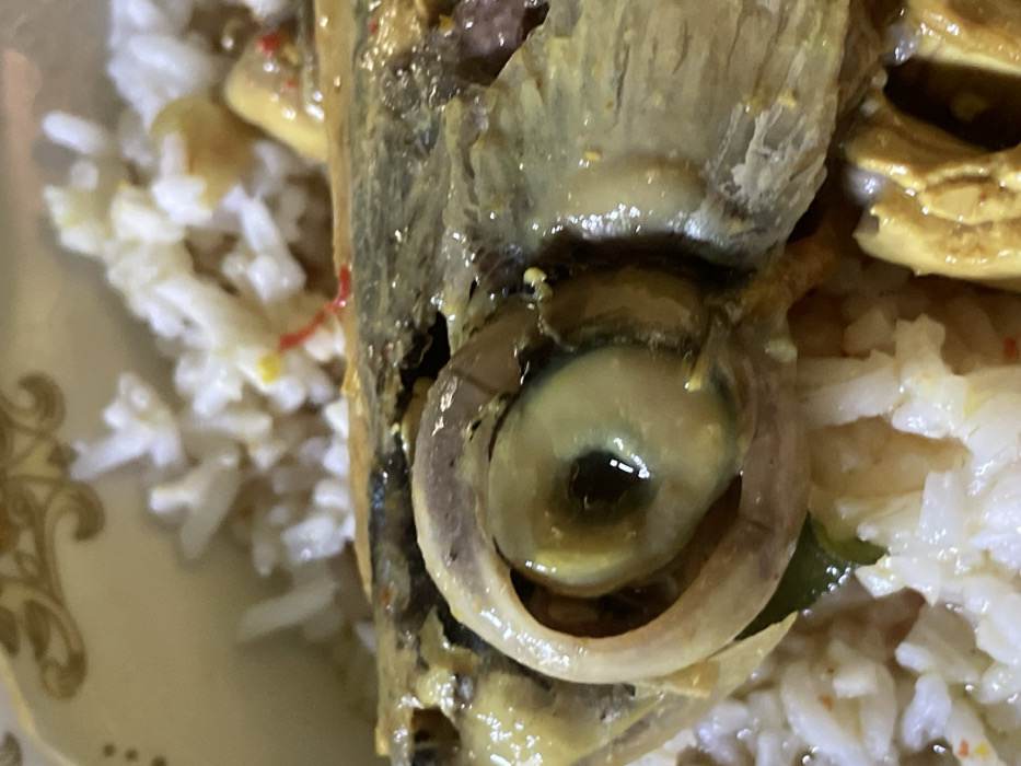 close-up of a cooked fish head served on a plate with rice. The fish eye is prominent, featuring a reflective black pupil, a yellowish iris, and a translucent outer layer. The surrounding fish flesh is grayish and coated in a glossy sauce. White rice fills the remaining space around the fish. A portion of the plate with an ornate gold design is visible at the left.