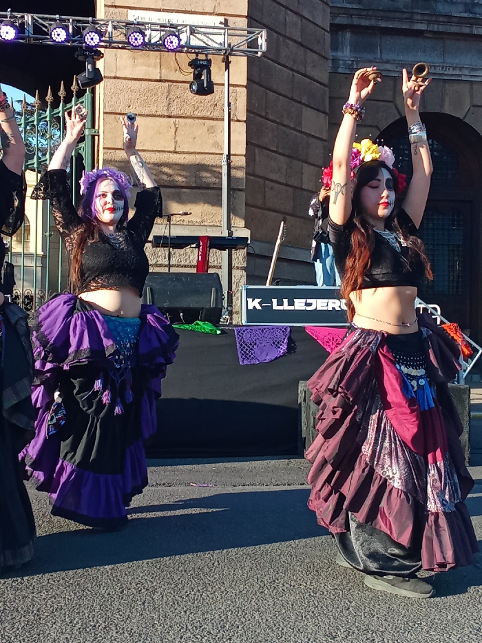Two women are captured mid-performance during an outdoor event in Recoleta, Chile, in front of a large, multi-story stone building with a prominent arched doorway. Both individuals stand on a paved surface, facing slightly forward with arms raised above their heads, each holding small, round percussive instruments. The woman on the left presents with purple hair, adorned with a purple floral crown, and features white skull-like face paint with black eye sockets and red lips. She wears a black lace long-sleeved crop top exposing her midriff and a voluminous, multi-layered skirt in purple and black, with a blue patterned fabric visible beneath. Tattoos are visible on both of her arms. The woman on the right has long dark hair, adorned with a colorful floral crown featuring red, yellow, and pink flowers. Her face exhibits split makeup, with the right side displaying a white skull-like design and the left side appearing naturally toned. She wears a black V-neck short-sleeved crop top, a thin waist chain, and a multi-layered skirt in burgundy, dark red, and patterned fabrics. An Ankh tattoo is visible on her left forearm. Behind the performers, a temporary stage structure is draped in black fabric, featuring a partially visible sign reading "K-LLEJERO." Draped on the stage are pieces of green, purple patterned, and pink fabric. A metal truss supports multiple stage lights, some emitting purple light. A guitar leans against sound equipment on the stage. The scene is illuminated by natural daylight, casting shadows on the ground.
