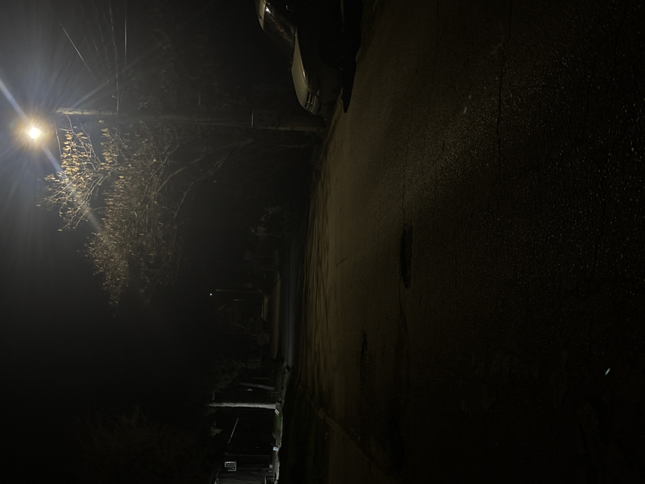 The image depicts a nighttime street scene in Pavlikeni, Bulgaria. An asphalt road, appearing wet or reflective, occupies the foreground and recedes into the dark background, exhibiting several visible cracks and two distinct potholes in the mid-ground. Illumination is primarily provided by a bright streetlamp positioned on a utility pole on the right side of the frame, which intensely lights the bare branches and pods of a nearby tree. A light-colored vehicle, likely silver or white, is partially visible parked on the shoulder to the right. On the left, a sidewalk runs parallel to the road, adjacent to a building with a faint light emanating from or reflecting onto its facade. Utility poles and overhead wires are present on both sides of the street. Dense shadows and obscured foliage line the street, contributing to the overall dimness and suggesting an absence of other significant light sources. No individuals or active subjects are discernible within the scene.