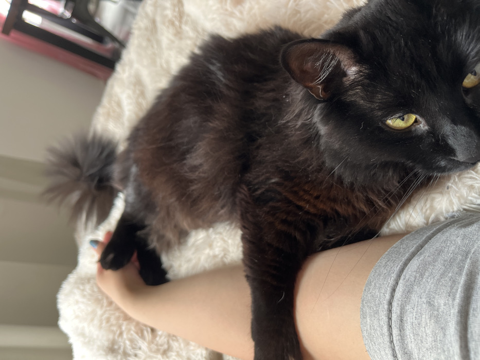 - "A long-haired black cat with bright yellow-green eyes lies on its back on a cream-colored, fluffy blanket, its head turned to face the viewer" by FM-Ucqa63, licensed under CC BY 4.0