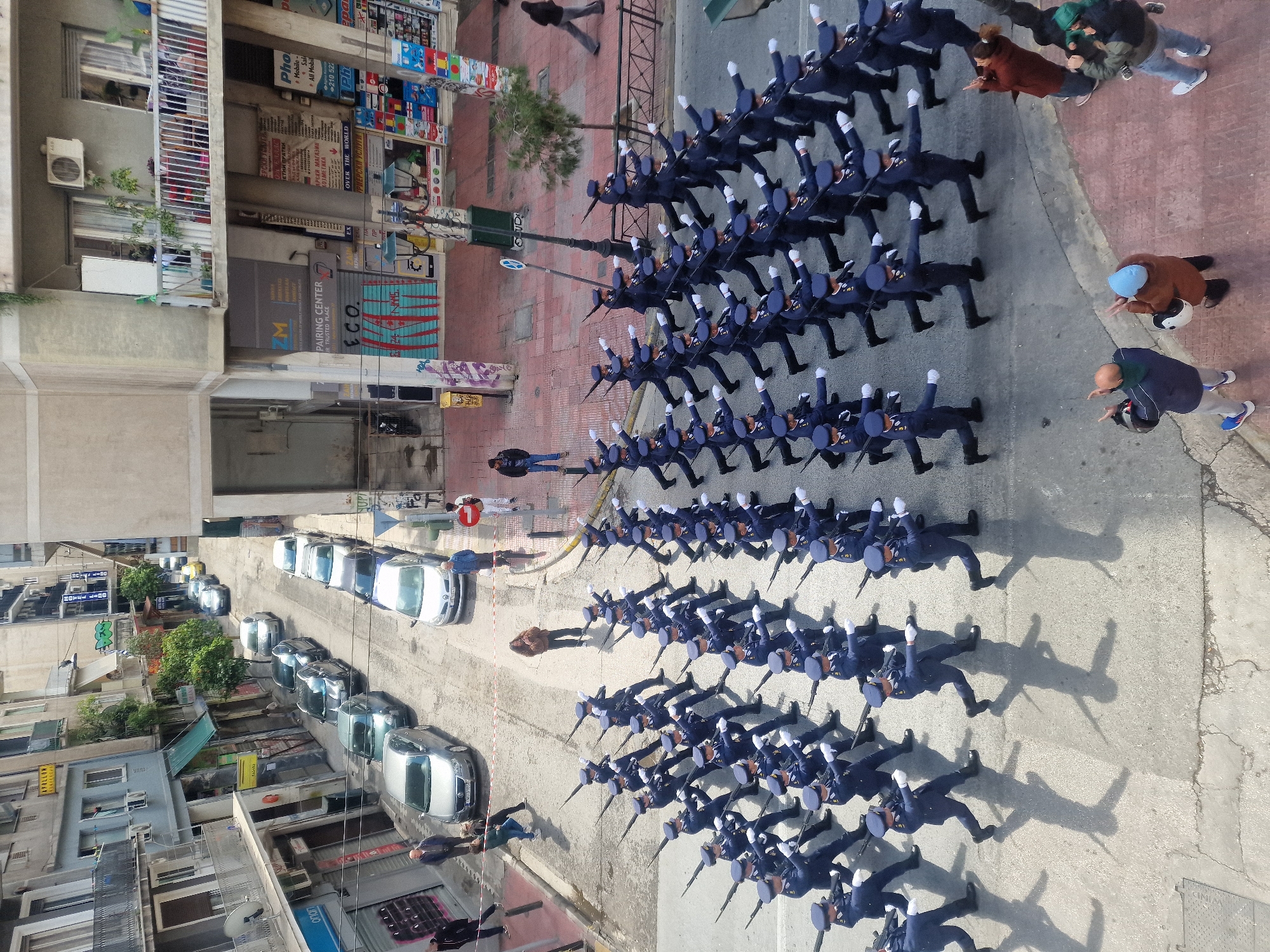 An elevated perspective captures a daytime parade on a commercial urban street in Athens, Greece. Approximately sixty individuals in dark blue uniforms, light-colored caps, white gloves, and black boots march in precise formation from right to left across the paved asphalt street, carrying ceremonial rifles. Their long shadows extend to their right. On a raised sidewalk in the immediate foreground, approximately eight spectators observe the parade. This group includes a man in a dark jacket holding a helmet and another individual in a brown jacket and light blue beanie. Further to the right, other spectators appear to be observing or photographing. The street is lined with multi-story buildings featuring balconies, air conditioning units, and ground-floor businesses. Prominent Greek-language signage includes "APOLLON TRAVEL," "ZM PAIRING CENTER ECO," "ΦΩΤΕΙΝΗ ΕΛΠΙΔΑ" (Bright Hope), "Φωτοτυπίες" (Photocopies), and "ΟΠΤΙΚΗ" (Optics). Some shop shutters and walls display graffiti. Numerous passenger cars, primarily silver and dark-colored sedans, are parked bumper-to-bumper along both sides of the street, indicating halted traffic. Street furniture such as lampposts, bollards, and a small tree are visible. A red and white barrier tape stretches across the street, separating spectators from the parade route. The scene is well-lit, suggesting clear weather.