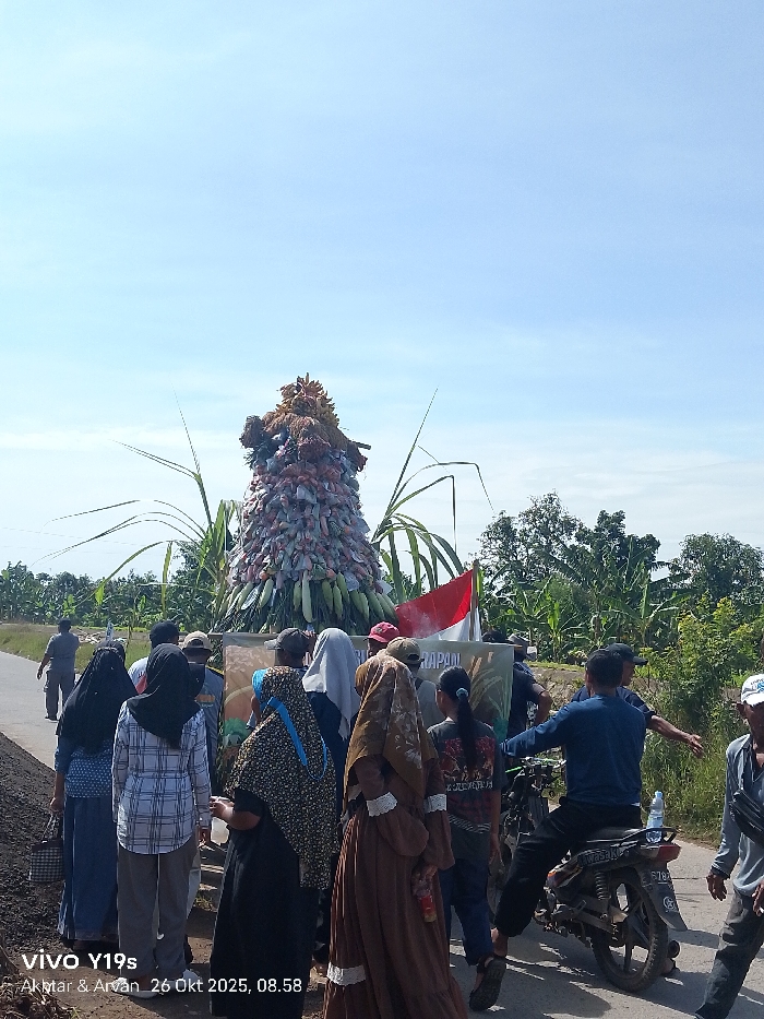 The image depicts an outdoor gathering in Wanguk, Indonesia, under bright daylight on October 26, 2025, at 08:58. The central focus is a large, conical offering structure, likely a *Gunungan*, constructed primarily from bundled small items (possibly packaged goods or money) in plastic wrappers, topped with a spiky, straw-like crown. Its lower section is visibly adorned with numerous fresh corn on the cob. Tall, leafy green stalks, resembling sugarcane, flank the structure. Approximately 15-20 individuals, predominantly adults, are gathered around the base of the *Gunungan*. Many are observing the structure, with some appearing to interact with it or each other. Several women wear headscarves (hijabs), and clothing styles vary from casual shirts and trousers to long dresses. A banner or sign with partially visible Indonesian text, including "HARAPAN" (hope), and an image of rice stalks is positioned behind the *Gunungan*. A small Indonesian flag (red and white) is affixed near this banner. To the right, a male individual is seated on a dark-colored motorcycle, while another man stands further right, partially out of frame. The scene is set on a paved road with a dirt or gravel shoulder on the left. Lush green trees and vegetation form the background, indicating a rural or semi-rural environment. The sky is clear and blue with minimal cloud cover.