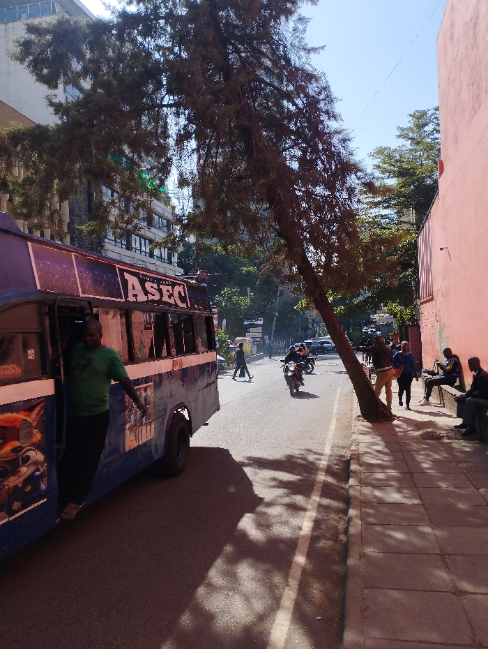 A blue and purple bus is parked on a city street with a man standing in the doorway. A large tree leans dramatically over the road, casting shadows. People are on the sidewalk, some standing and others sitting. A motorcycle drives down the street. Buildings and other trees are visible in the background under a clear sky.