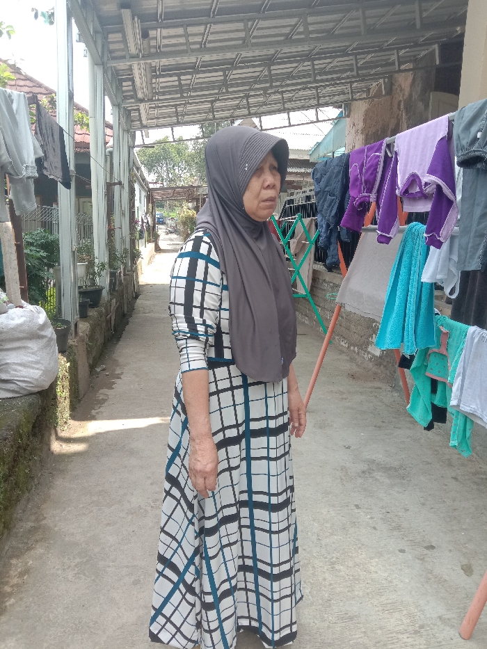 An adult female stands on a concrete pathway in Ciherang, Indonesia, oriented slightly right of the camera's view