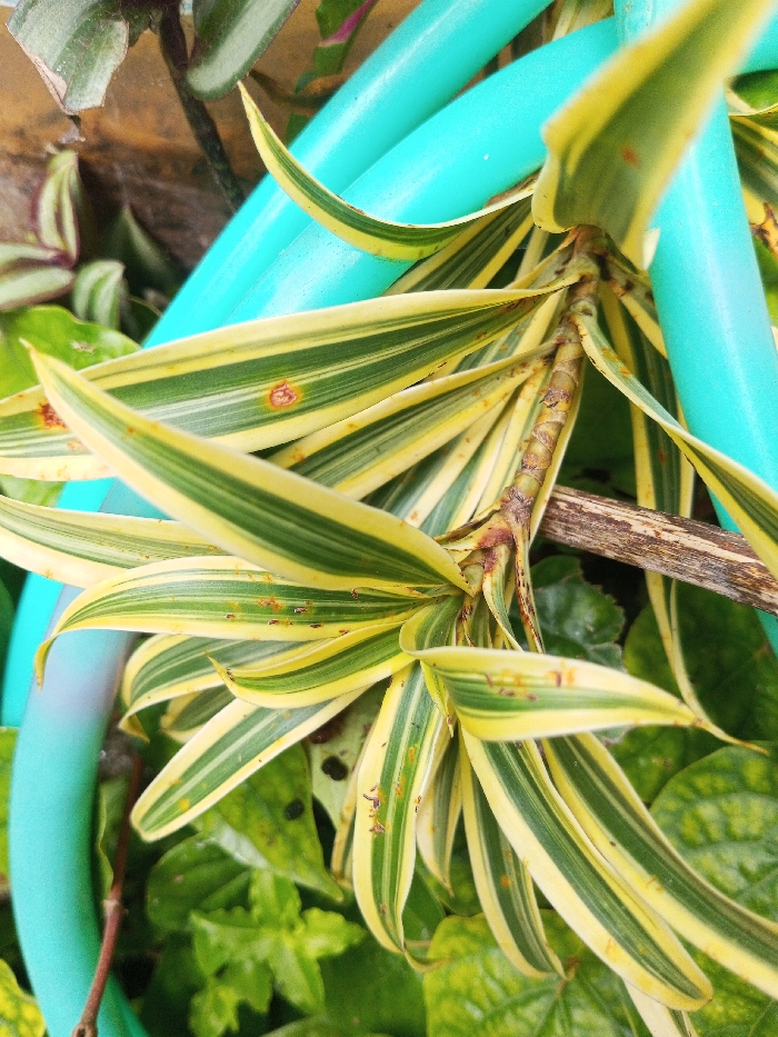 - "A close-up image taken in Mindat, Myanmar, displays a variegated plant with lanceolate leaves featuring prominent yellow and green longitudinal stripes" by FM-inGXo2, licensed under CC BY 4.0