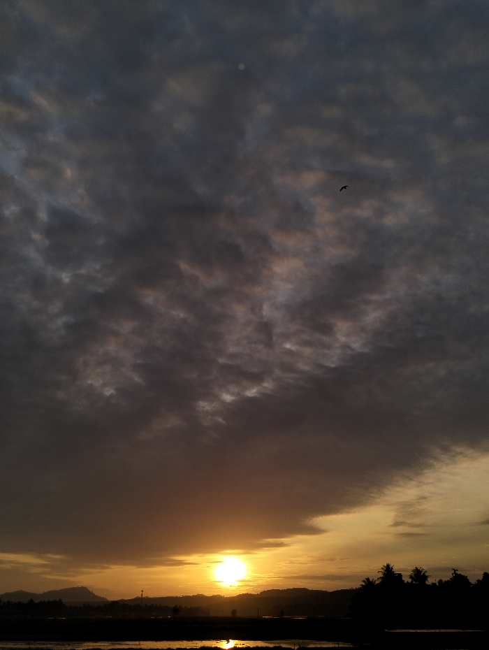 A dramatic sunset scene features a low horizon line with silhouetted trees and hills. Above, the sky is filled with heavy, textured clouds, transitioning from dark gray at the top to a soft golden hue near the sun. The sun shines brightly, just above the horizon, creating a strong central point of light that reflects on the still water in the foreground. A bird is seen in the upper sky.