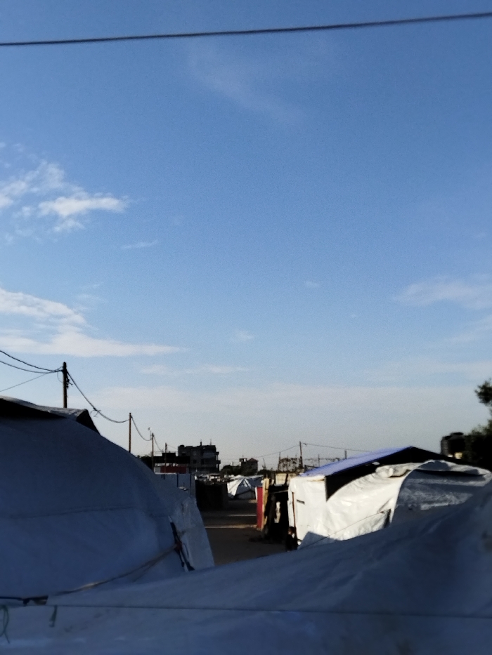 An outdoor shot captures a camp of white canvas tents under a clear blue sky with scattered clouds. The tents are densely packed, suggesting a temporary or refugee settlement. A path weaves between the tents, leading to buildings in the background. Overhead power lines stretch across the scene. The composition frames the tents in the foreground with the buildings in the distance.
