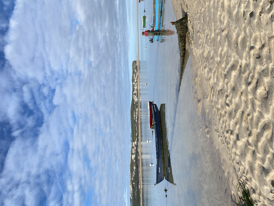 The image captures a detailed scene at the Foz do Arelho lagoon, near Caldas da Rainha, Portugal, under a partly cloudy sky. The foreground features a light sandy beach with distinct ripple marks created by water, along with small patches of green seaweed. On the right, a partially submerged, dark wooden structure covered in seaweed protrudes from the water's edge. The midground comprises the calm, reflective water of the lagoon. Several small boats are moored; a prominent dark blue boat, with "RATO PMB" visible on its stern, is positioned on the left. Further back and to its right, a red boat is anchored. On the right side of the frame, a light blue boat is visible, with a single individual standing beside it in the water. This person wears dark waders, a red top, and a wide-brimmed hat. A green boat is moored further in the background to the right. White spherical buoys are scattered across the water. The background reveals a distant landmass characterized by sandy dunes and cliffs, topped with numerous scattered white buildings, indicating a settlement. The sky above is light blue, partially covered by scattered white cumulus clouds, with a faint contrail visible in the upper-left quadrant.