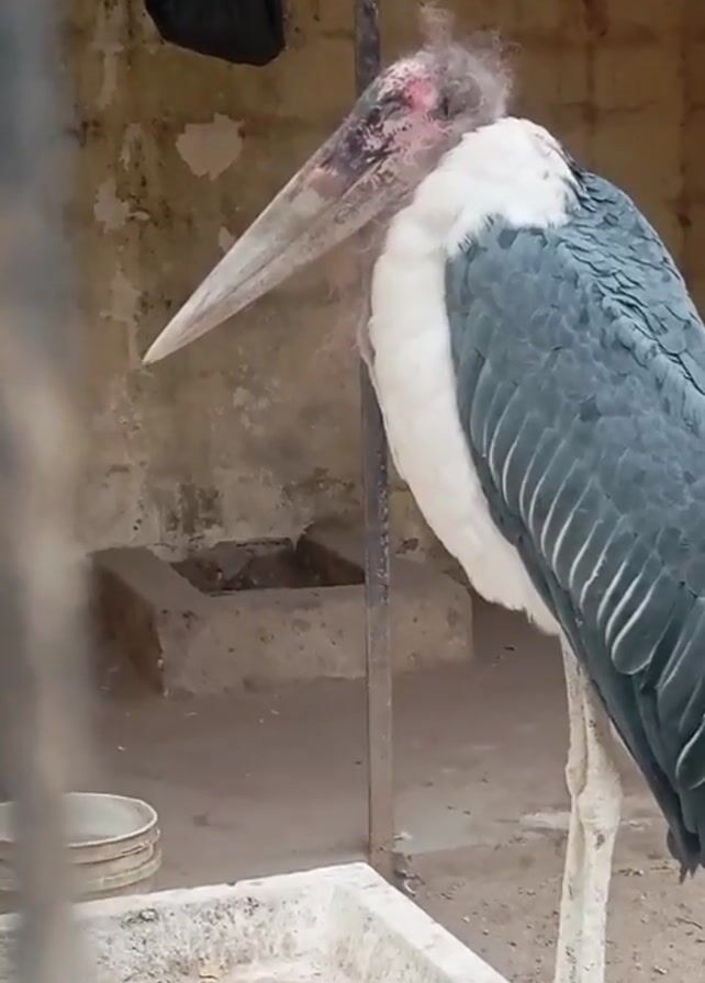 Marabou Stork standing on a concrete ledge in what appears to be an enclosure. The bird is large, with a white chest and dark gray wings. It has a long, gray beak and a sparsely-feathered head with pinkish skin. The background includes a weathered concrete wall, a metal pole, and what looks like a drinking trough. The camera is positioned behind a wire fence, partially obscuring the view. The bird makes a short, guttural sound.