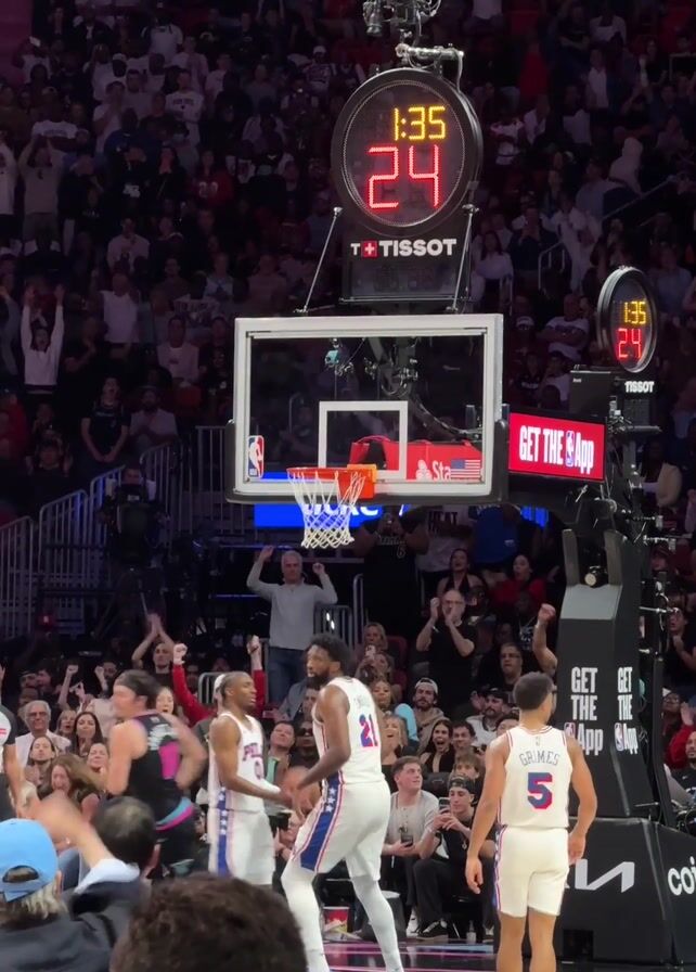Here is a forensic description of the video: The video shows an indoor basketball game, possibly at an NBA level. In the foreground are several basketball players wearing different team uniforms; one player in a Philadelphia 76ers uniform with the number 21, and a Miami Heat player with the number 9. The basketball net is visible after a successful shot, and the scoreboard shows 1:35 remaining. Behind the players is a large crowd in the stadium stands. A referee is also present in the foreground. The stadium features various advertising displays, including promotional material for "GET THE APP" and "FANDUEL SPORTS NETWORK." The footage captures the excitement of the game with the crowd reacting to the action.