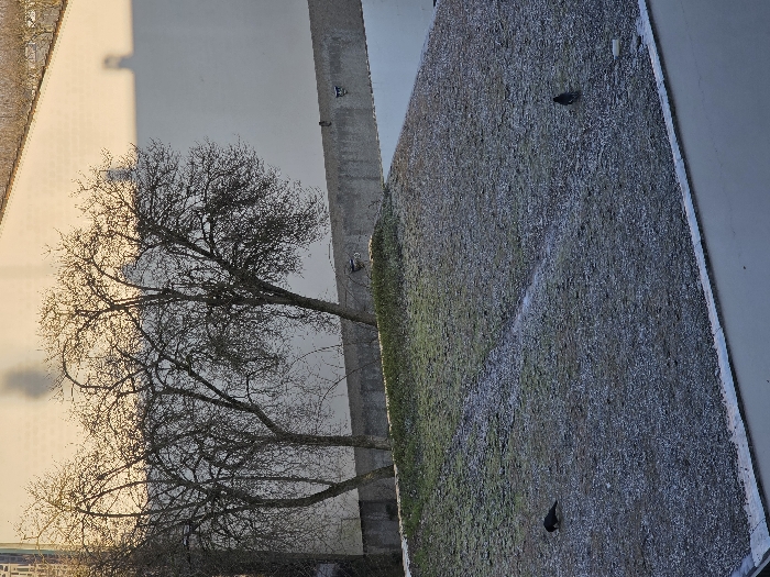 The scene, viewed from an elevated perspective in Unknown, Unknown, depicts an outdoor urban or suburban environment under natural light. In the foreground, a flat, light-toned, unidentifiable surface runs horizontally. The central area consists of a large, sloped ground expanse primarily covered in small, light-colored gravel or pebbles, with a diagonal band of denser gravel or a slight depression. Patches of green vegetation are visible, particularly on a raised mound located in the upper-left section of this ground. Two black crows are present on the gravel surface: one on the left is oriented towards the right, with its head directed downwards towards the ground, suggesting foraging behavior. The second crow is positioned on the right, standing upright and facing left. Behind the green mound, three deciduous trees with bare branches are silhouetted against a flat, off-white building wall. The wall is illuminated by sunlight from the right, casting a prominent dark shadow in its upper-right quadrant. A concrete ledge or parapet runs along the base of the wall, upon which several small, dark, cylindrical fixtures are mounted. No human subjects are visible within the frame.