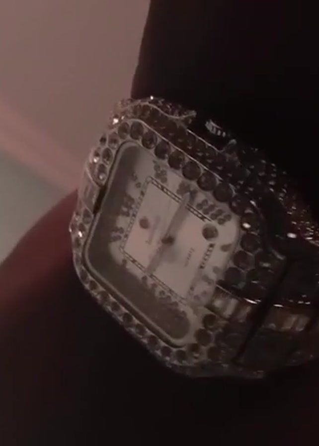 A close-up shot shows a person's wrist with a silver-colored watch covered in rhinestones