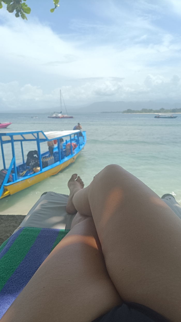 A person reclines on a beach lounger, legs crossed in the foreground. A striped blue and green towel is visible beneath. In the background, clear turquoise water leads to a horizon with distant land. Several boats dot the water, including a colorful blue and yellow boat to the left. The sky is partially cloudy, with hints of blue. Leaves hang down from the top left corner.