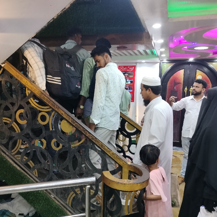 A group climbs a staircase with intricate black and gold railing. A man in a white robe and skullcap stands near a child in pink at the base. Another man in white directs people near a door, his hand gesturing. A woman in a black hijab stands to the right. The staircase has green padding. An advertisement is visible in the background. The ceiling is lit with pink and green lights.
