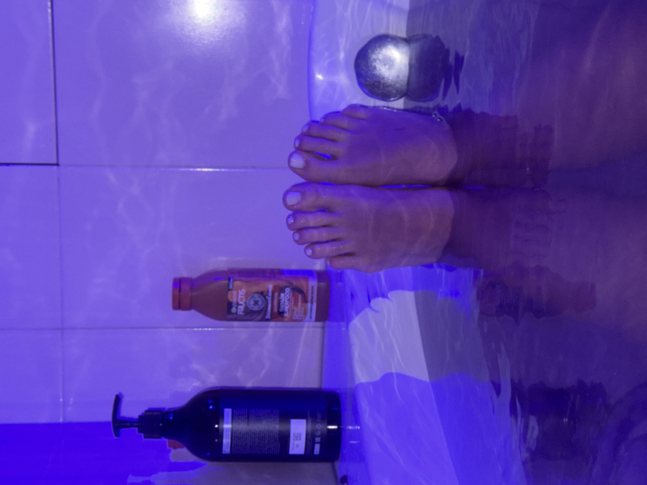 The scene depicts a bathroom interior in Khimki, Russia, observed from a low angle. The primary focus is a pair of human feet, presumably belonging to one individual, partially submerged in water within a white bathtub. The toenails are painted a light, opaque color. On the rim of the bathtub, two bottles are visible to the left of the feet. The leftmost bottle is dark, opaque, and features a black pump dispenser. Its rear label displays white text, including a barcode and what appears to be Cyrillic and English characters. To its right stands an orange, translucent bottle with a screw-top cap. Its label clearly identifies it as "GARNIER FRUCTIS" and "SUPERFOOD," with "ПАПАЙЯ" (Papaya) also visible in Cyrillic. To the right of the feet, resting on the tub's edge, is a metallic, spherical or ovoid object with a reflective surface. The water in the tub exhibits ripples and reflections, and the background consists of white rectangular wall tiles with visible grout lines. The entire scene is illuminated by a strong, uniform purple and blue ambient light, creating reflections and coloring the water and surrounding surfaces.