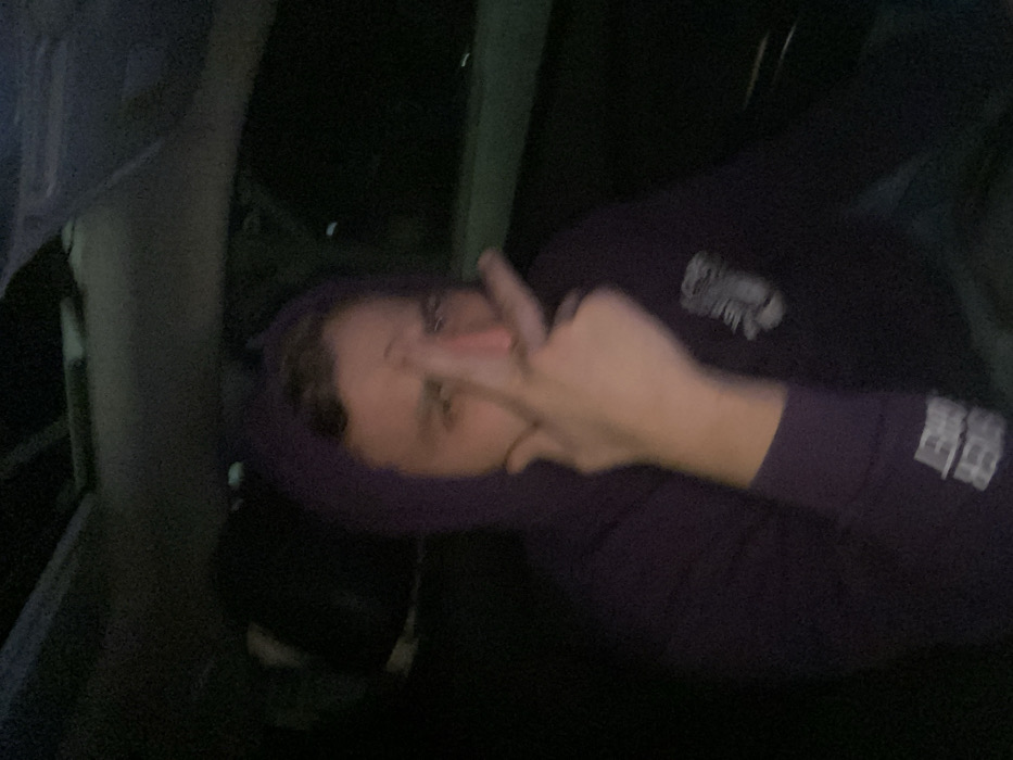 A male individual is seated inside what appears to be a vehicle, likely at night or in a low-light setting