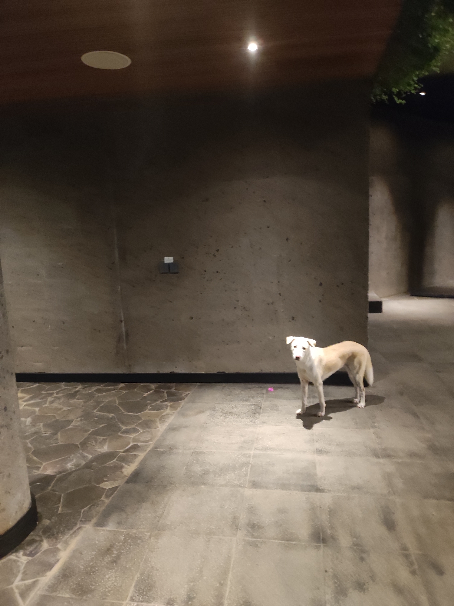 This image captures a medium-sized, short-haired dog standing in a modern, artificially lit covered walkway or interior space in Mas, Indonesia. The dog, predominantly cream-white with a lighter head and legs, is positioned centrally, facing directly towards the camera. It stands on a light gray tiled floor with visible grout lines and some surface imperfections. To the left of the dog, the floor transitions into an irregular pattern of darker gray and brown flagstones. A small, crumpled pink object lies on the tiled floor to the dog's left, near its hind leg. The surrounding walls are constructed of dark gray, textured concrete. On the left wall, a small, white rectangular object with a black base is affixed at mid-height. The dark brown ceiling features two visible recessed circular light fixtures, one larger and white on the far left, and a smaller, brighter spotlight on the right, which illuminates the scene. Shadows are cast beneath the dog and along the base of the walls due to the overhead lighting. A dark, possibly curved corridor or recessed area is visible behind the dog and to its right. A glimpse of green foliage is present in the upper right corner, suggesting an adjacent outdoor or open-air section. No other individuals or animals are present in the scene.