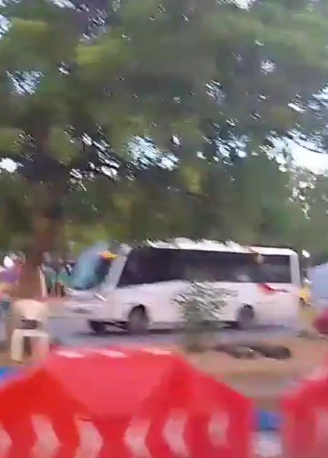 view from a moving vehicle passing by a construction site with orange traffic barriers. The camera moves quickly and then pans to show a street with buildings, trees, and people. There is a motorcycle on the sidewalk in front of a store called "Pet Center."