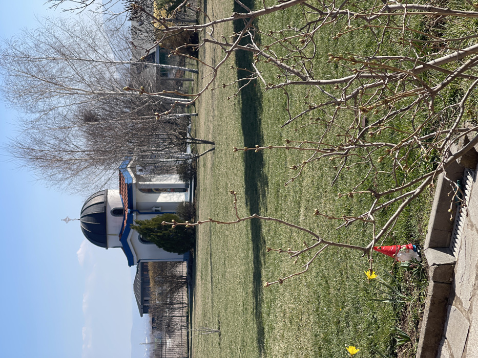 The image displays an outdoor scene in Golyanovtsi, Bulgaria, under a clear blue sky. In the mid-ground, a small, white chapel-like building with a black dome roof topped by a metallic cross stands on a well-maintained green lawn. The building features blue trim along its eaves and a section of terracotta-colored roof tiles beneath the dome. A small evergreen shrub is positioned to the left of the building. Behind the chapel, a metal fence is visible, separating the lawn from distant residential structures with dark roofs and light walls. A distant mountain range is visible on the horizon. Several bare deciduous trees with white bark are scattered across the lawn. In the immediate foreground, numerous bare branches of shrubs with emerging leaf buds are prominent. A concrete curb with an integrated metal drainage grate runs horizontally across the bottom right. To the left of the foreground branches, within a planting bed bordered by the concrete curb, two yellow daffodils are in bloom, next to a garden gnome figurine wearing a red pointed hat, white beard, blue shirt, and red pants. The scene is brightly illuminated by direct sunlight, casting shadows across the grass. There are no people visible.