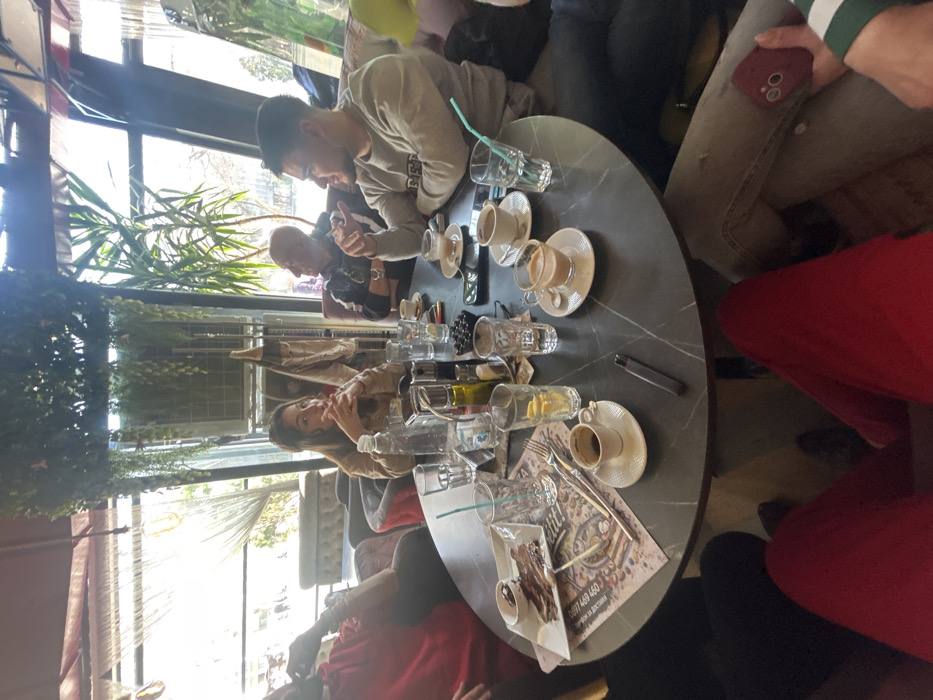 The scene is inside Petitto Coffee & Bar, located at ul. "Oborishte" 4, 6300 Haskovo, Bulgaria. Six individuals are seated around a dark, circular marble-patterned table in a bright, modern cafe interior. The setting is illuminated by significant natural light entering through large windows, revealing glimpses of the street outside. **Individuals:** 1. **Foreground Left:** A person wearing a red long-sleeved shirt, with their left arm resting on the table. 2. **Midground Left:** A female with dark hair, wearing a light beige or brown top, seated facing right, with hands clasped on the table. She appears to be looking towards the camera or slightly left. 3. **Midground Center-Right:** An older bald male, wearing a dark top, seated facing left with his right arm crossed. He is looking towards the left. 4. **Midground Right:** A male with short dark hair, wearing a light grey long-sleeved sweatshirt, seated facing left, gesturing or resting his left hand on the table. He is engaged in conversation with the individuals to his left. 5. **Foreground Right:** The lower body of a person wearing light-colored trousers, holding a red smartphone with their left hand. A white and green striped cuff is visible on their left wrist. 6. **Foreground Bottom Center:** The lower body of a person wearing red trousers. **Table Contents (Clockwise from Foreground Left):** * A white rectangular plate holds two chocolate-drizzled crepes or similar pastries, accompanied by a fork and knife. * A crumpled paper placemat printed with "PETITTO" and phone number "0897 469 460" is beneath the food plate. * Near the female in the midground, a clear plastic water bottle, a glass shaker of black pepper, a glass bottle of olive oil, and a small bowl of dark olives are present. * Multiple clear drinking glasses, some empty, some containing liquid and lemon slices, are scattered across the table. * Several white espresso cups and saucers, some containing liquid (coffee, latte, or cappuccino), are positioned around the table. * A clear glass with a blue straw is located on the right side of the table. * A black pen-style vaping device (e-cigarette) rests on the table surface near the bottom center. **Environment:** The cafe features upholstered seating, some in dark grey and others with red accents. Overhead and in the background, artificial hanging greenery and a large potted plant contribute to the decor. Sunlight creates bright reflections on interior surfaces and through the window panes.