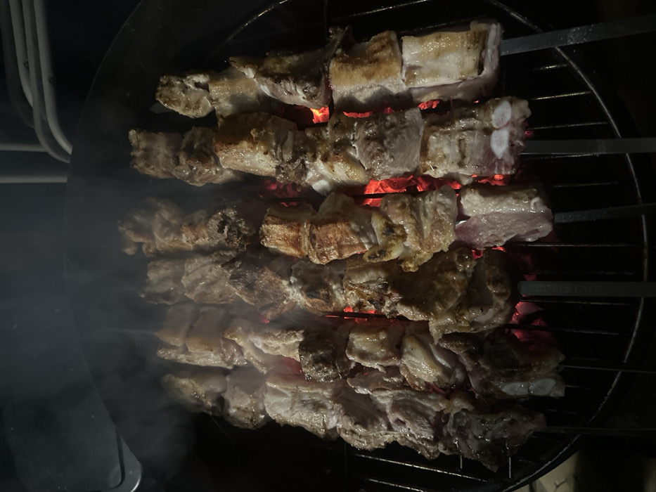 - "Four skewers of cubed meat, likely pork, cook over hot coals on a circular grill" by FM-aVDG03, licensed under CC BY 4.0