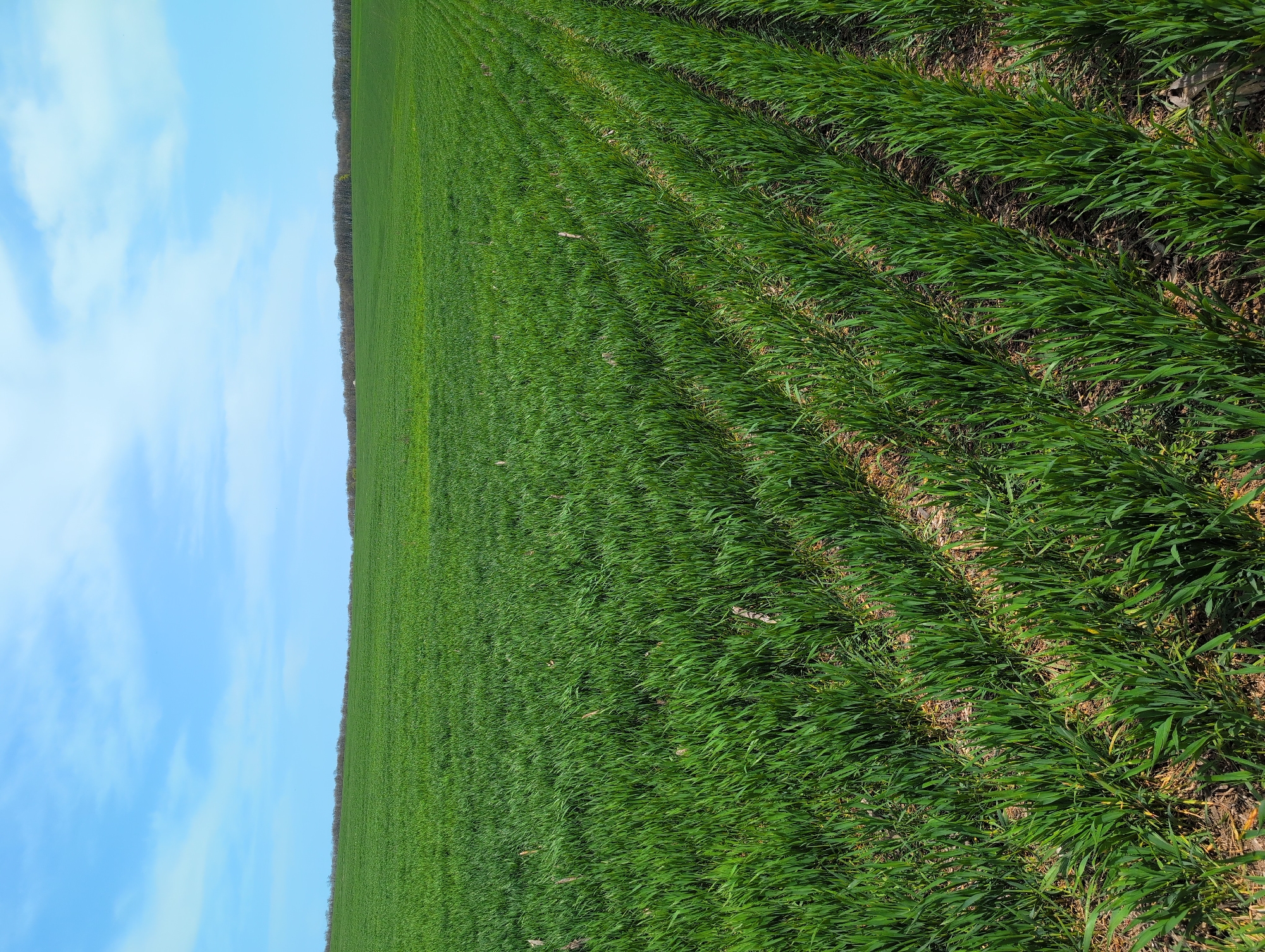 field of young, green crops in Pomoshtitsa, Bulgaria. The field stretches to the horizon, where it meets a line of trees. The sky is blue with scattered clouds. Rows of crops are visible, indicating cultivation. The perspective is a ground-level view, showing the density and uniformity of the vegetation.