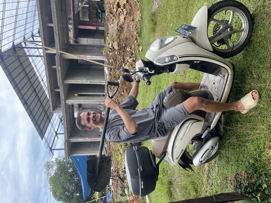 A man sits on a light-colored scooter with a black storage case in a grassy area. He holds a spade or shovel upright. A building under construction rises in the background. The scooter has a license plate that reads "DK 6857 YD." The man wears a grey shirt, grey shorts, and white sandals. The grass appears wet, suggesting recent rain.