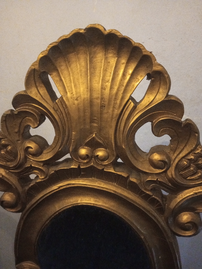An ornate, antique gold frame dominates the image. The top section features a stylized seashell design, flanked by scrolling, decorative flourishes. Below, the frame curves into an oval shape, housing a dark, possibly velvet-covered, interior. The frame's surface shows detailed carving and appears aged. The background is a plain, light-colored wall.