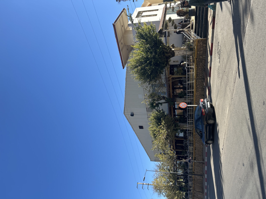 The scene depicts a street view in El Hajeb, Morocco, under a clear, bright blue sky. In the center and background, a large commercial structure with a light beige corrugated metal facade and a gabled roof is visible, flanked by a smaller, multi-story white building with a distinctive flat, cantilevered roof section on the right. An elevated outdoor terrace, furnished with numerous tables and chairs, extends across the front of these buildings, enclosed by a dark railing and supported by a stone-faced wall at street level. Several mature trees with green foliage are positioned along the terrace, casting shadows. On the asphalt street in the foreground, a black sedan with a Moroccan license plate (6-93259) is parked or slowly moving towards the right. A red and white striped curb separates the street from the raised terrace. A circular red and white no-stopping/no-parking sign is prominently displayed near the street edge of the terrace. Further left, a street light pole and a triangular warning sign are present. Several individuals are dispersed across the scene: one man in a green jacket holding a blue bag is partially visible on the far right, facing left. Multiple figures are seated or standing on the outdoor terrace, and a group of individuals are visible near the entrance staircase of the white building on the right. Overhead power lines traverse the upper portion of the image. The scene is illuminated by strong sunlight, indicated by distinct shadows on the road surface.