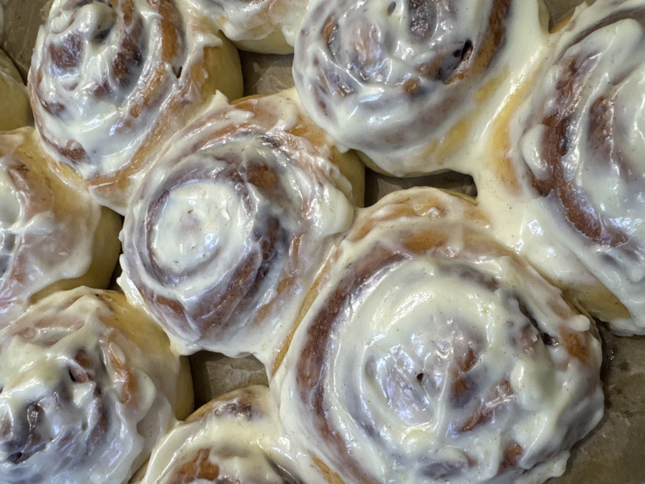 - "Nine freshly baked cinnamon rolls, heavily coated in a thick, opaque white glaze, are presented in a close-up, overhead view" by FM-SwIAh1, licensed under CC BY 4.0