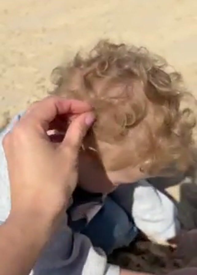A close-up shot shows a toddler with curly blonde hair wearing a grey shirt and blue jeans on a sandy beach. A hand gently strokes the child's head. The background reveals a sunny beach scene with the ocean and a clear blue sky. The camera angle is slightly tilted, moving from the child's head to encompass a wider view of the beach.
