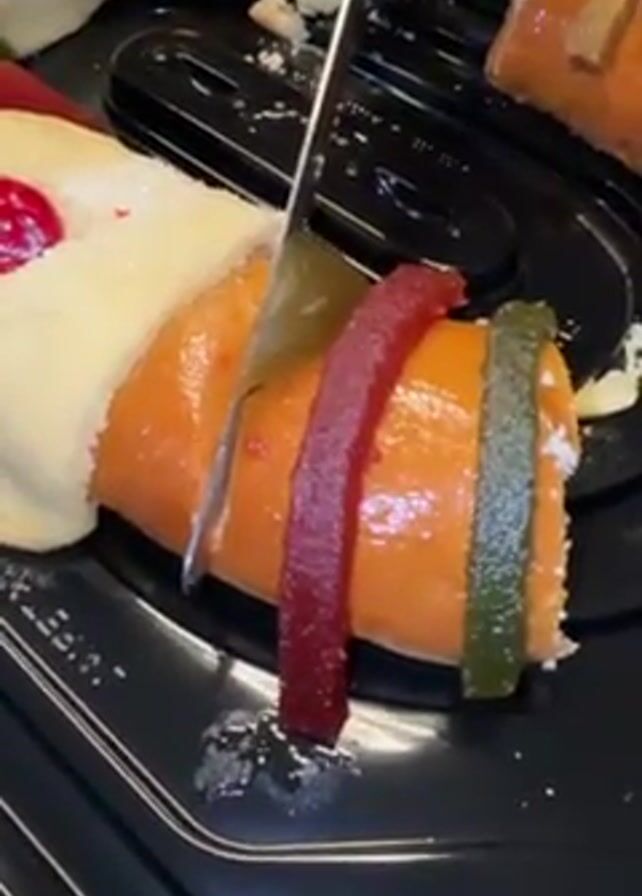 - "A hand uses a silver knife to cut a slice of Rosca de Reyes, a traditional Spanish and Latin American sweet bread, on a black plastic tray" by FM-avfjN2, licensed under CC BY 4.0