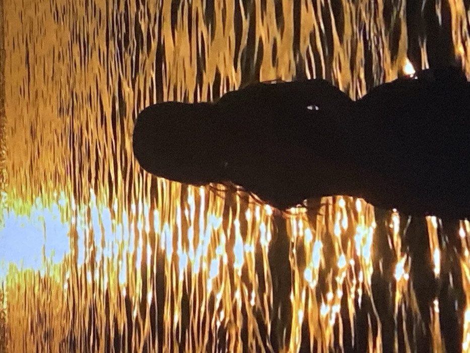 A dark, silhouetted object, possibly an animal's head, occupies the right side of the frame