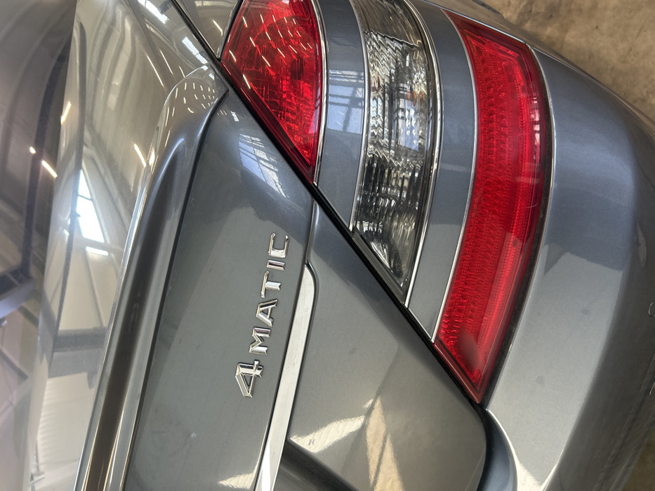 The image displays the rear section of a grey sedan, observed from a slightly elevated, angled perspective. The vehicle's trunk lid features an integrated spoiler and a chrome "4 MATIC" emblem positioned on the lower left side, above a horizontal chrome trim strip. To the right, a multi-segment taillight assembly is visible, comprising upper and lower red light sections flanking a clear middle section. Reflections of overhead linear lighting fixtures and possibly windows are evident on the vehicle's glossy surface, suggesting an indoor setting such as a garage or showroom. A portion of the rear bumper is visible below the taillight, with a single circular sensor element discernible on the lower left. There are no people present. The scene is located in Tsaratsovo, Bulgaria.