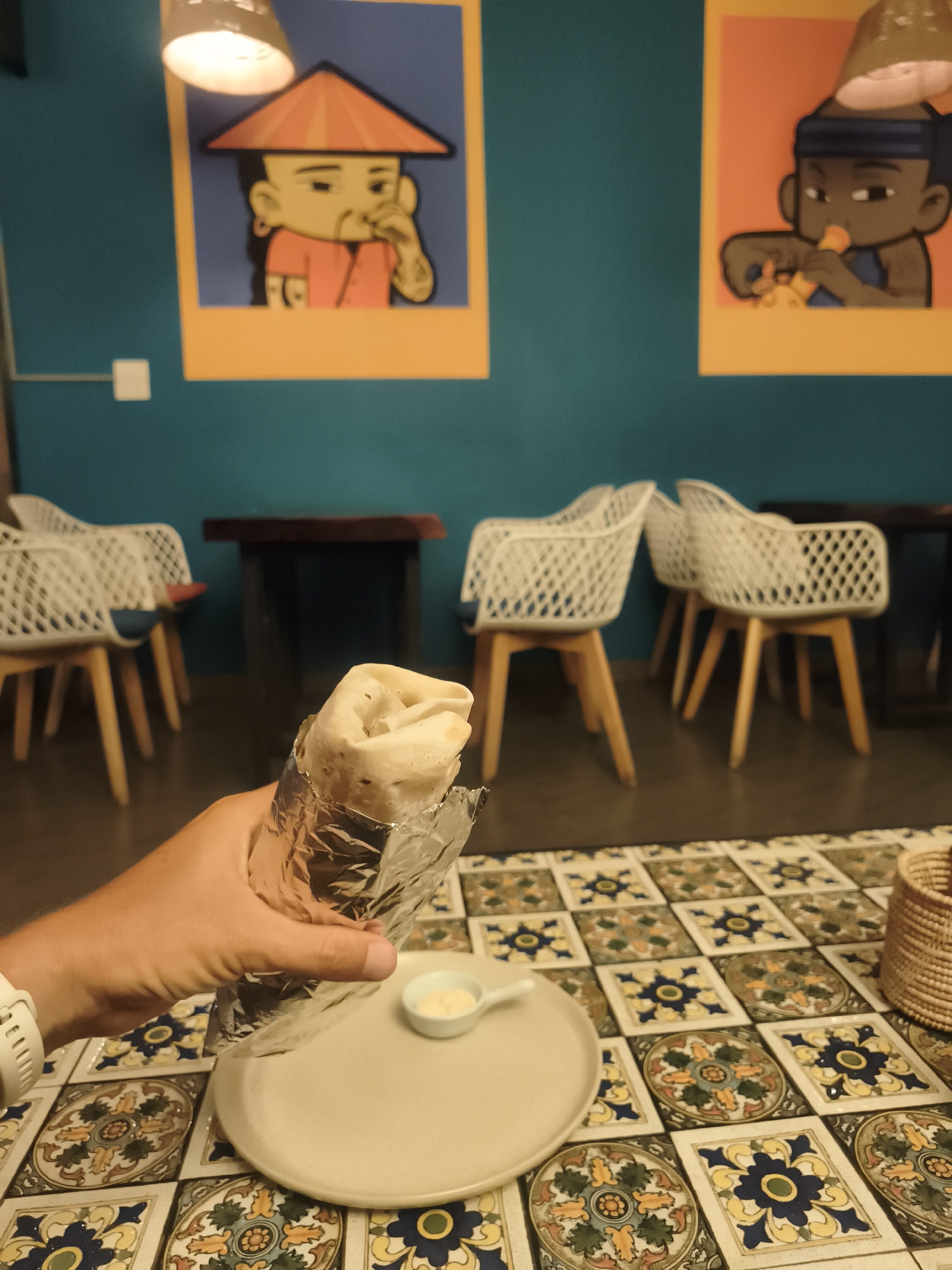 The scene depicts a person holding a wrap, possibly a shawarma, partially unwrapped from foil packaging. A small dish containing a light-colored sauce rests on a plate beneath the wrap. The background features a restaurant or eatery setting, with teal walls adorned with cartoon-style paintings in yellow frames. There are white, net-designed chairs surrounding dark-topped tables. The table surface is decorated with patterned tiles. The photo appears to be taken indoors, likely in a restaurant in Baan Bo Phut, Thailand. There is a visible light fixture hanging from the ceiling. A small woven basket is situated on the table.