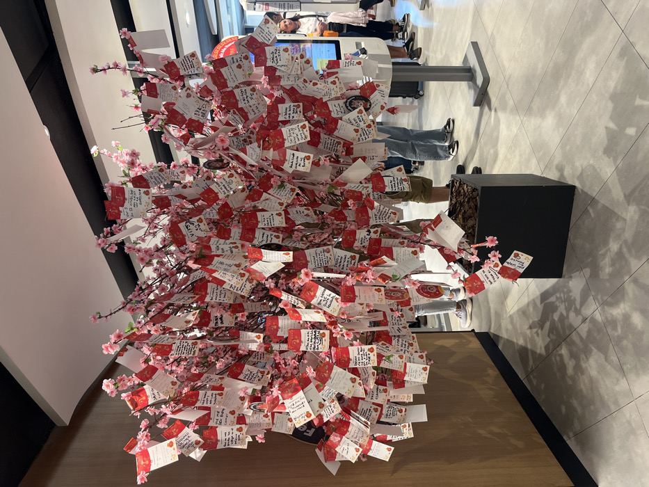 The image displays an artificial cherry blossom tree, heavily adorned with numerous handwritten notes attached to small red and white paper slips, some featuring a red strawberry icon