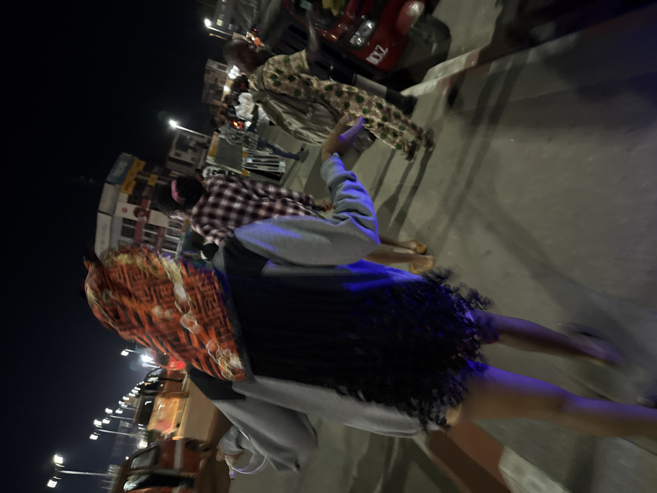 A low-angle shot depicts a street scene at night. A person wearing an orange and black patterned top, gray hoodie, and black skirt is the foreground. Two other people are walking nearby. Streetlights illuminate buildings on the left. A red vehicle is on the right. The image has motion blur, giving a sense of movement.