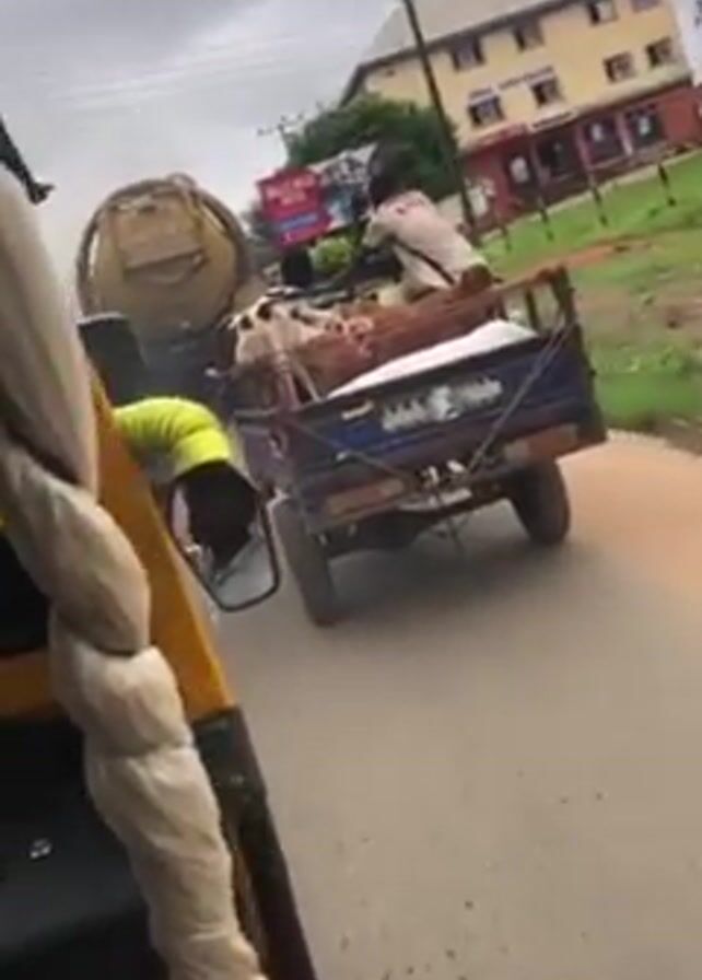 three-wheeled vehicle driving down a road behind a small truck. The truck bed is filled with several goats and a white sack. A man wearing a light-colored outfit sits amongst the goats, holding onto the side of the truck bed. The environment appears to be a street in a somewhat urban area with buildings and a billboard visible in the background. The day is overcast.