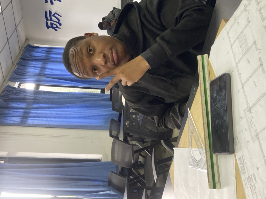 A young man wearing a black hoodie sits at a desk in a classroom. He points towards the camera with a playful expression. In front of him are architectural plans, a ruler, a protractor, and a cell phone. Rows of empty chairs fill the room behind him, with blue curtains covering the window. Two people are visible in the background; one is seated further back, near a wall with Chinese characters printed on it. The overall scene suggests a classroom or studio environment.