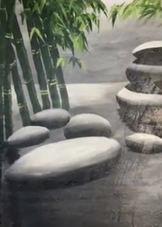 close-up view of a painting. The painting depicts a serene scene with bamboo stalks on the left side of the frame, and a stack of rocks on the right. Several gray stones are scattered across the bottom half of the painting. The background is a hazy gray.