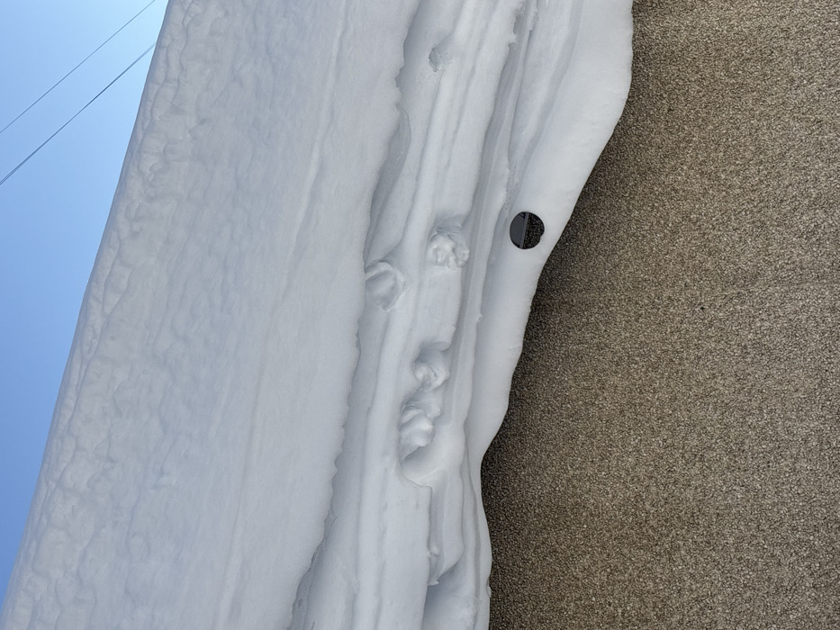 The scene, located in Chaikovsky, Russia, features a substantial, layered snowdrift under a clear sky