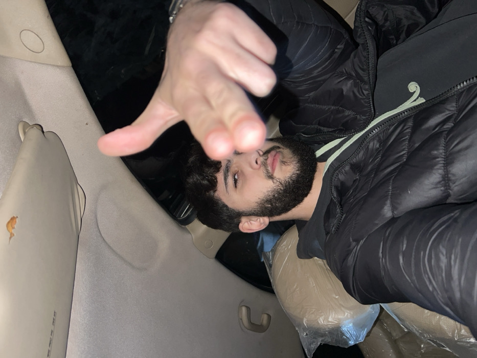 A bearded man is inside a vehicle, possibly the back seat, wearing a black puffer jacket over a t-shirt. His right hand is extended towards the camera, making a gun gesture with his fingers. The interior of the car is visible, including the tan-colored sun visor and parts of the seats covered with plastic. The photo is taken from a low angle, giving the impression of someone looking down.