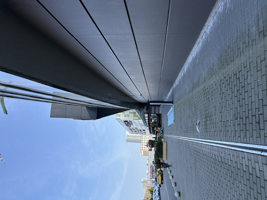 The image depicts an outdoor scene at Burgas Plaza, a shopping mall in Burgas, Bulgaria. The right side of the frame is dominated by the modern, dark grey, horizontally paneled facade of the mall building, which extends upwards to reveal sections of glass and lighter-colored panels. A greenish-brown sculptural element is visible on the roofline of the building. A clear blue sky occupies the upper portion of the image, with one white bird in flight in the upper-left quadrant. In the foreground, a grey brick paver walkway stretches longitudinally from the bottom towards the background. A metal drainage grate runs centrally along this walkway. White residue, consistent with salt or de-icing agents, is visible along the base of the dark grey building. A single female individual, dressed in a dark coat and trousers, walks along the paved walkway, moving away from the viewer towards the background. To the left of the walkway, a parking lot contains multiple parked vehicles, predominantly white cars, with at least one yellow car visible. Grey, spherical concrete bollards delineate the edge of the parking area from the pedestrian path. Adjacent to the building, beneath a dark awning, an outdoor cafe area is present, furnished with tables and chairs. Near this area, a multi-colored children's ride is visible on the pavement. Blue painted markings on the ground indicate a designated area for bicycle parking, with associated metal racks. Several taller, multi-story buildings are observable in the distant background, beyond the parking lot.