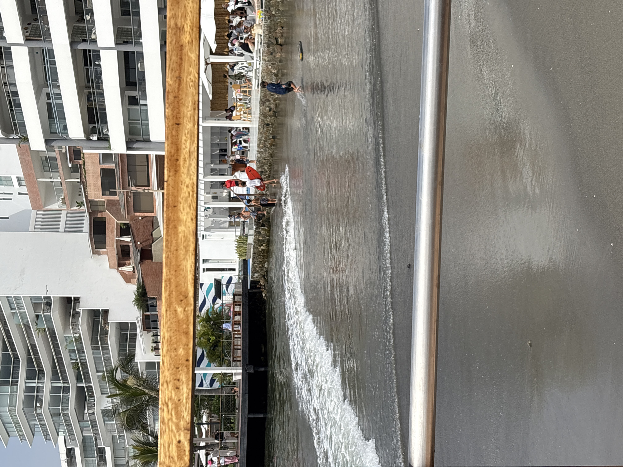 coastal scene in Ancón, Peru, with a view from an elevated position. On the left side, there are tall buildings with balconies, including residential apartments. In the center of the frame, there is a beach with people engaged in water activities. A line of breaking waves is visible. A pier extends into the water, with people walking along it. On the right side of the image, there is a railing, partially obscuring the view. In the background, there is a beachside establishment with people seated under a covered area. The image appears to be taken during the day, with sunlight illuminating the scene.