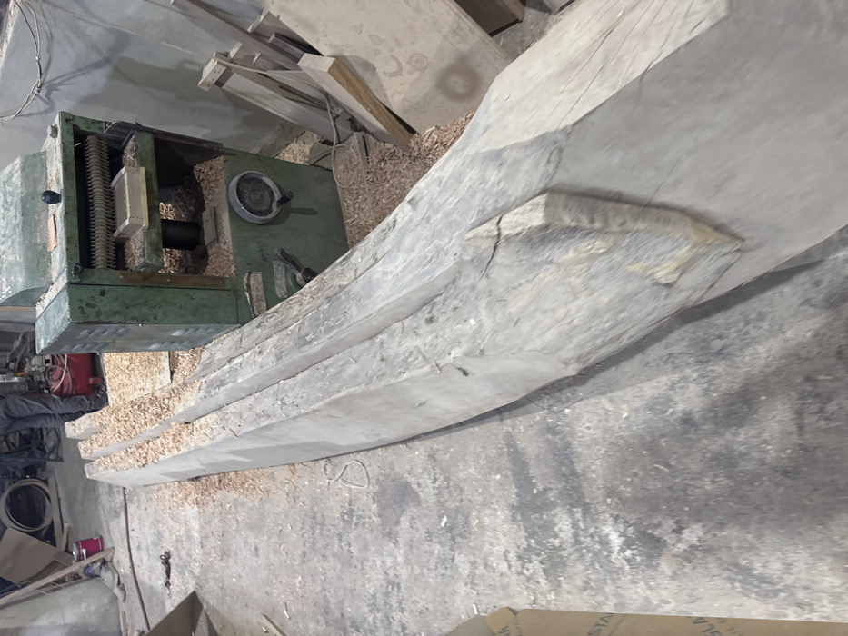 woodworking shop in Sbeneh, Syria. A large piece of wood is being run through a planer, which is a large, green, industrial machine with a metal bed and a rotating blade. Wood shavings are scattered on the floor around the machine, and a worker is standing nearby. The wood being planed is rough-hewn and is being smoothed down by the machine. The shop is fairly clean, with a concrete floor and a well-lit work area. The wood being planed is about 10 feet long and 2 feet wide. The worker is wearing blue jeans and a white shirt. The planer is in the middle of the image, and the wood is being fed into the machine from the right. The shop is located at the coordinates 33.447, 36.278.