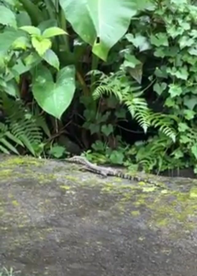 small monitor lizard sitting on a mossy rock in front of dense vegetation. The lizard is light gray with black bands on its tail. The vegetation includes large, heart-shaped leaves and ferns. The rock is covered in green moss. Voices are heard in the background.