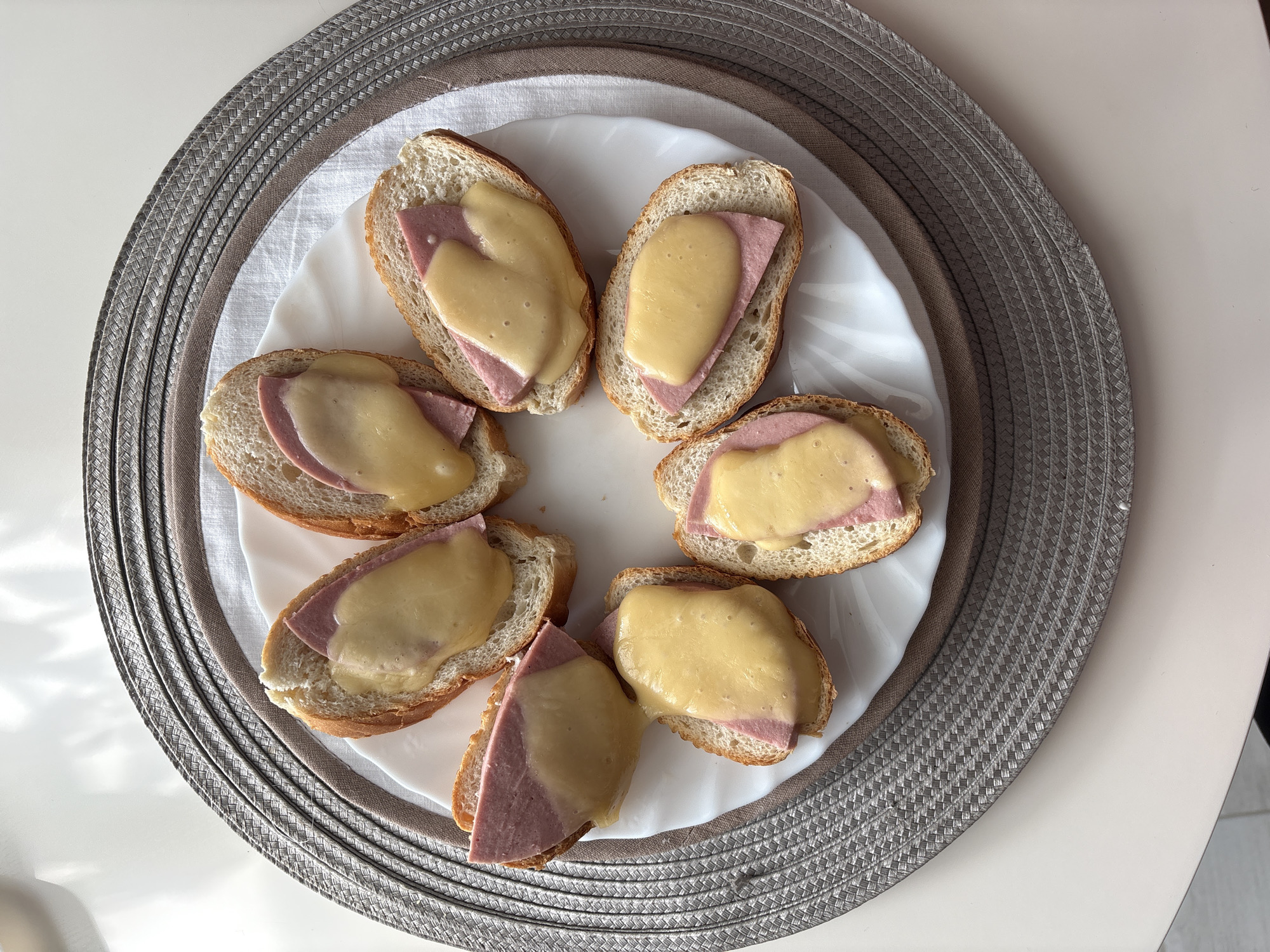 The image, reportedly from Votkinsk, Russia, displays an overhead view of a white, round plate centered on a dark grey, woven placemat. Seven open-faced sandwiches are arranged in a circular formation on the plate. Each sandwich consists of an oval-shaped slice of white bread, topped with a slice of pinkish-brown processed meat, and a melted, glossy layer of yellow cheese or cheese sauce. The placemat rests on a light-colored, reflective tabletop. Shadows are visible on the tabletop to the left and top, indicating an indoor setting with illumination from an unseen source. No individuals, specific actions, or further environmental identifiers for the stated city location are present.