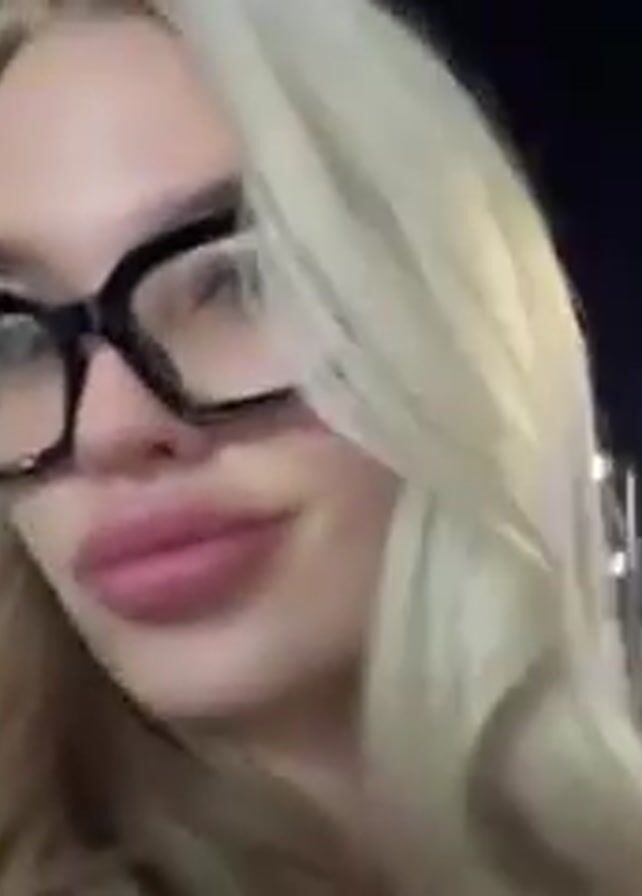 woman with blonde hair and large, black-framed glasses standing outside at night. She is wearing a dark-colored sweater or jacket. She has prominent lips and makes a kissing face towards the camera. The background includes buildings and streetlights, suggesting she is in an urban environment. The overall lighting is dim.