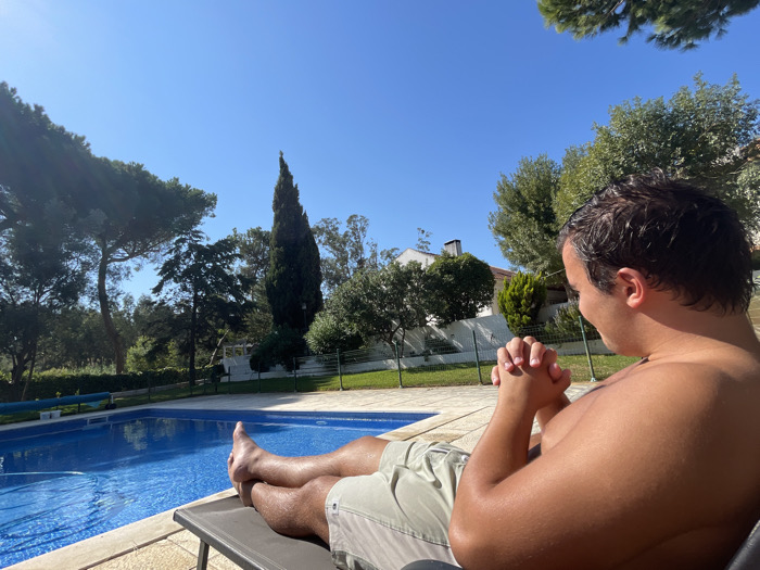 The image displays an outdoor residential scene in Almada, Portugal, under a clear blue sky. A male individual, appearing to be in his late teens or early twenties, is seated on a dark-colored lounge chair adjacent to a swimming pool. He is shirtless, wearing light-colored shorts, and his bare feet are extended. His hands are clasped in front of him, and he is positioned with his back partially to the camera, looking towards the right side of the frame. The foreground features a rectangular swimming pool with blue water, edged by light-colored paving stones. A blue pool cover or roller mechanism is visible at the far end of the pool. The background consists of abundant green foliage, including tall pine trees, a distinctive slender coniferous tree, and other deciduous and evergreen trees. Beyond the treeline, sections of white residential buildings with terracotta-colored roofs and chimneys are discernible. A wire fence runs along the perimeter of the property. The scene is brightly illuminated by direct sunlight.