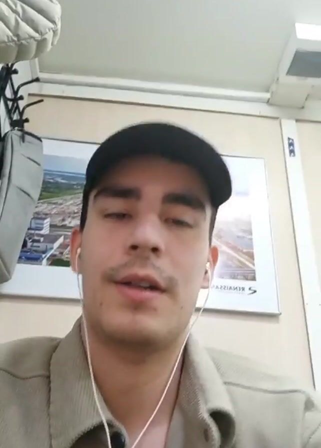 A young man with light brown skin, a mustache, and wearing a black baseball cap and a tan corduroy jacket is recording a video. He is wearing wired earbuds. In the background is a white wall with a framed picture of an industrial landscape, a grey shoulder bag hanging on the wall, and a white ceiling with a vent. The man is looking at the camera and speaking.